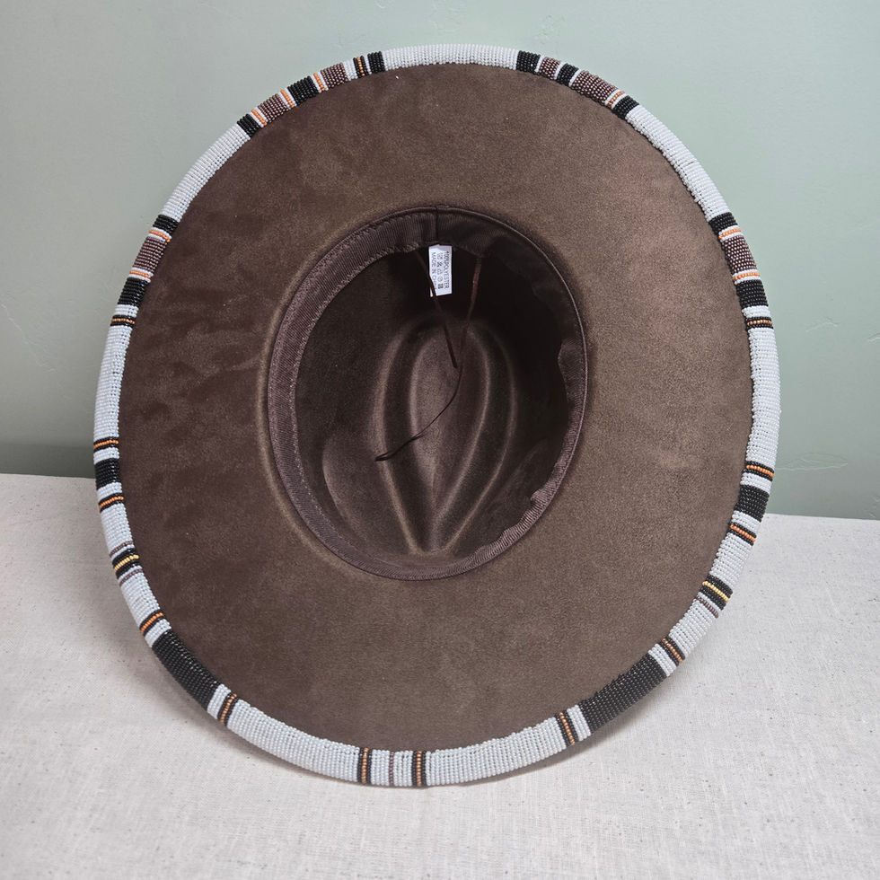 Brown Suede Cowboy Hat with Beaded Brim and Feather Accent