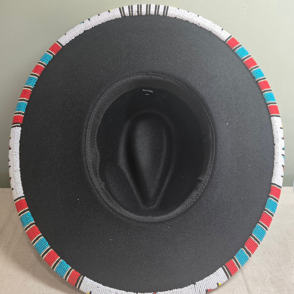 A sleek black felt wide-brim hat featuring a bold hand-beaded trim in vibrant turquoise, red, white, yellow, and black geometric patterns. The intricate beadwork adds a striking Southwestern flair, perfectly balancing tradition and modern elegance.