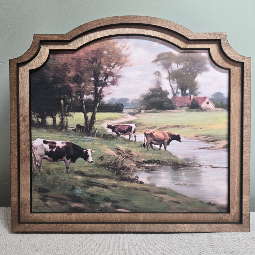 A serene framed canvas print capturing two horses standing quietly by a reflective pool in a misty meadow. Soft gray tones and muted earth colors create a calm, almost ethereal atmosphere, while a tall tree with autumn-hued leaves anchors the composition. The tranquil scene evokes peace, companionship, and the quiet beauty of nature at dawn, making it a perfect piece for rustic, farmhouse, or nature-inspired décor.